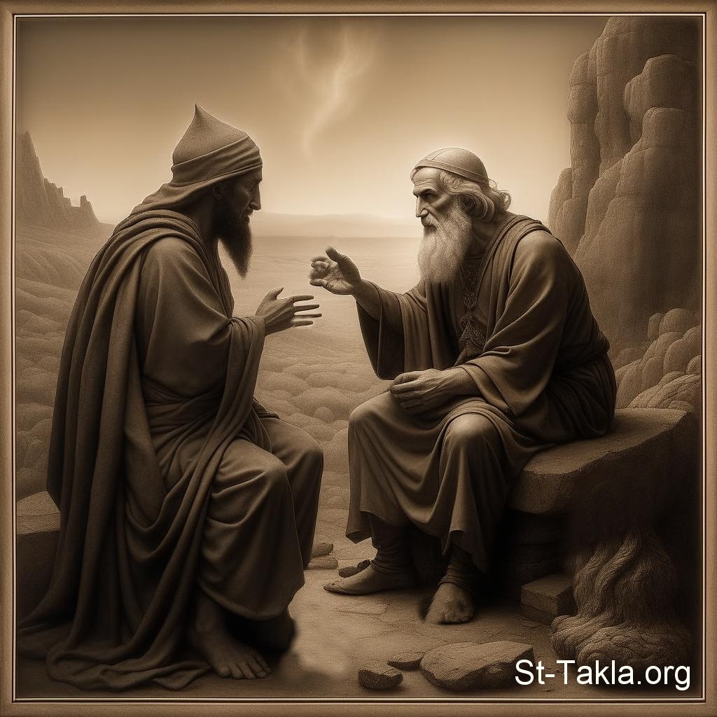 اثنان من الآباء يتحدثان (صورة 37)، محادثة، مناقشة، قديسان، رهبان - فن بالذكاء الاصطناعي، فكرة مايكل غالي لموقع الأنبا تكلاهيمانوت، 30 يناير 2024 م.
