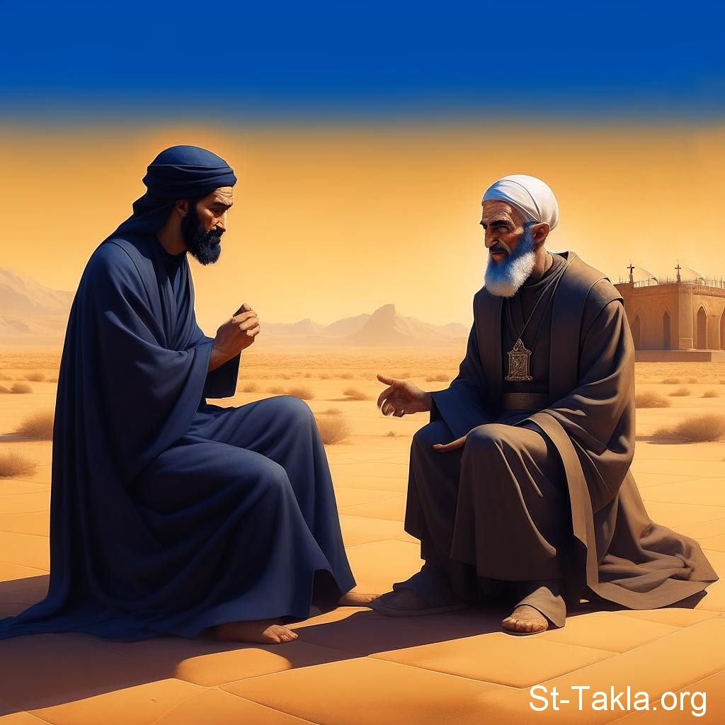 اثنان من الآباء يتحدثان (صورة 42)، محادثة، مناقشة، قديسان، رهبان - فن بالذكاء الاصطناعي، فكرة مايكل غالي لموقع الأنبا تكلاهيمانوت، 30 يناير 2024 م.
