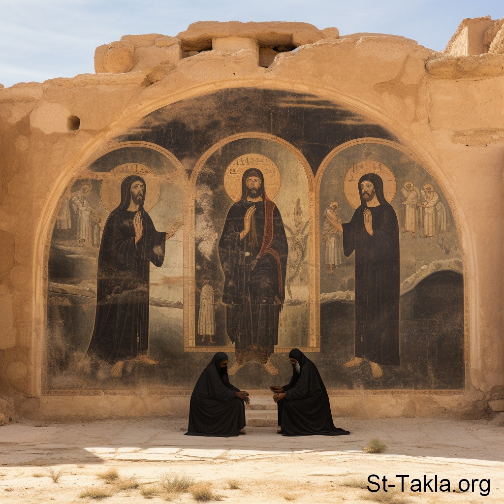 اثنان من الآباء يتحدثان (صورة 78)، محادثة، مناقشة، قديسان، رهبان - فن بالذكاء الاصطناعي، فكرة مايكل غالي لموقع الأنبا تكلاهيمانوت، 30 يناير 2024 م.