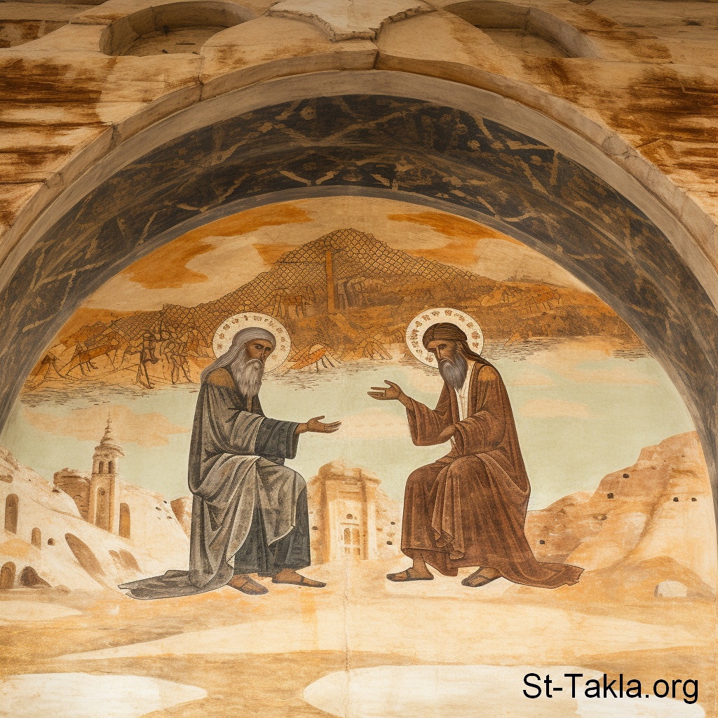 اثنان من الآباء يتحدثان (صورة 84)، محادثة، مناقشة، قديسان، رهبان - فن بالذكاء الاصطناعي، فكرة مايكل غالي لموقع الأنبا تكلاهيمانوت، 30 يناير 2024 م.
