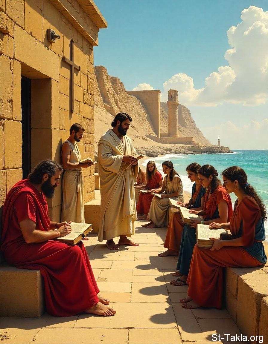 تخيل لشكل مدرسة الإسكندرية اللاهوتية في مصر في القرون الأولى (الكلية الإكليريكية: مدرسة الإسكندرية المسيحية: ديداسكاليوم)، التلمذة الروحية، الدراسات الدينية المسيحية، التعليم الروحي واللاهوتي، الطلاب والمعلم (صورة 29) - فن بالذكاء الاصطناعي، فكرة مايكل غالي لموقع الأنبا تكلاهيمانوت، 30 نوفمبر 2024 م.
