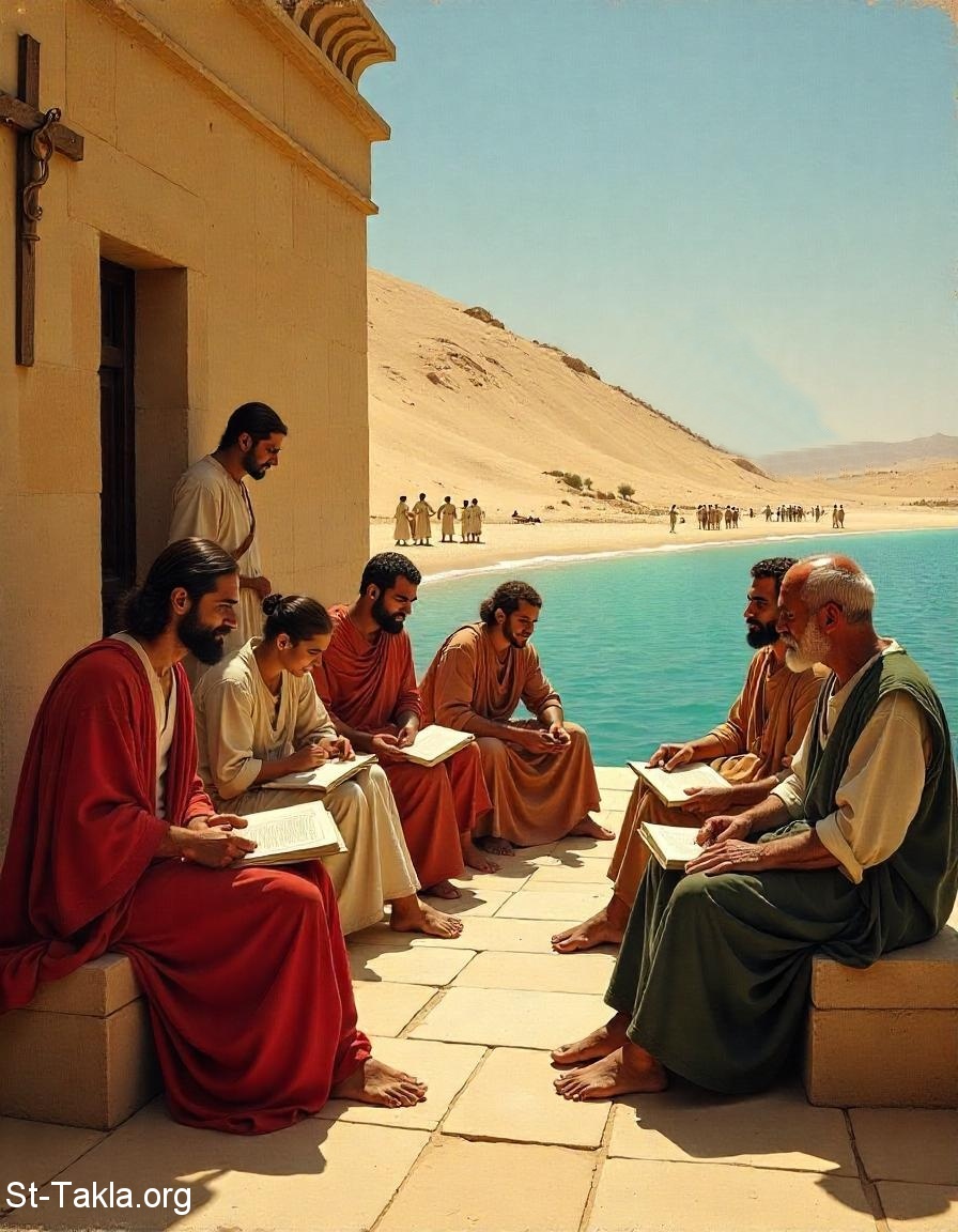 تخيل لشكل مدرسة الإسكندرية اللاهوتية في مصر في القرون الأولى (الكلية الإكليريكية: مدرسة الإسكندرية المسيحية: ديداسكاليوم)، التلمذة الروحية، الدراسات الدينية المسيحية، التعليم الروحي واللاهوتي، الطلاب والمعلم (صورة 31) - فن بالذكاء الاصطناعي، فكرة مايكل غالي لموقع الأنبا تكلاهيمانوت، 30 نوفمبر 2024 م.