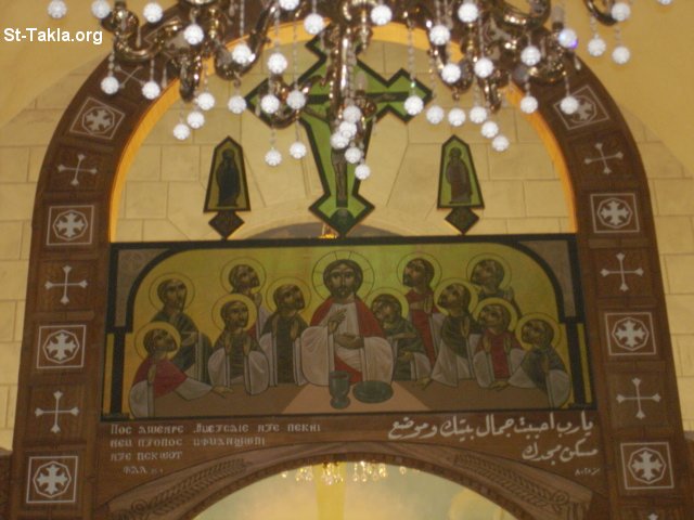 The Classic Coptic Last Supper painting by the late Issac Fanous - Coptic architecture and icons of Saint TaklaHaimanout Coptic Orthodox Church, Alexandria, Egypt, after 2007 reconstruction - Photograph by Michael Ghaly for St-Takla.org.