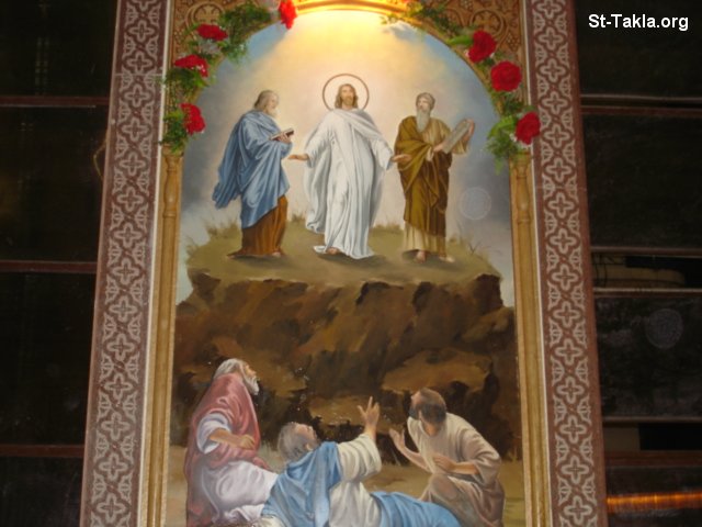 ايقونة التجلي - من الفن القبطي الحديث للفنان سامى حنس - صور العمارة القبطية بكنيسة الأنبا تكلاهيمانوت، الإبراهيمية، الإسكندرية، بعد ترميم عام 2007 - تصوير مايكل غالي لـ: موقع الأنبا تكلا هيمانوت.