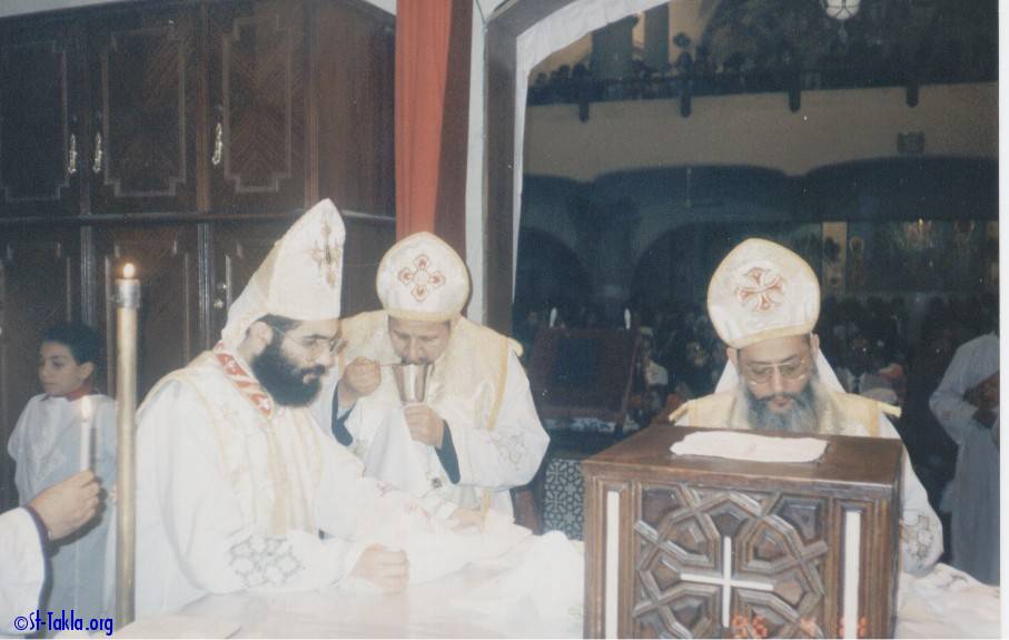 آباء كهنة كنيسة الأنبا تكلا داخل الهيكل، الإسكندرية، مصر.