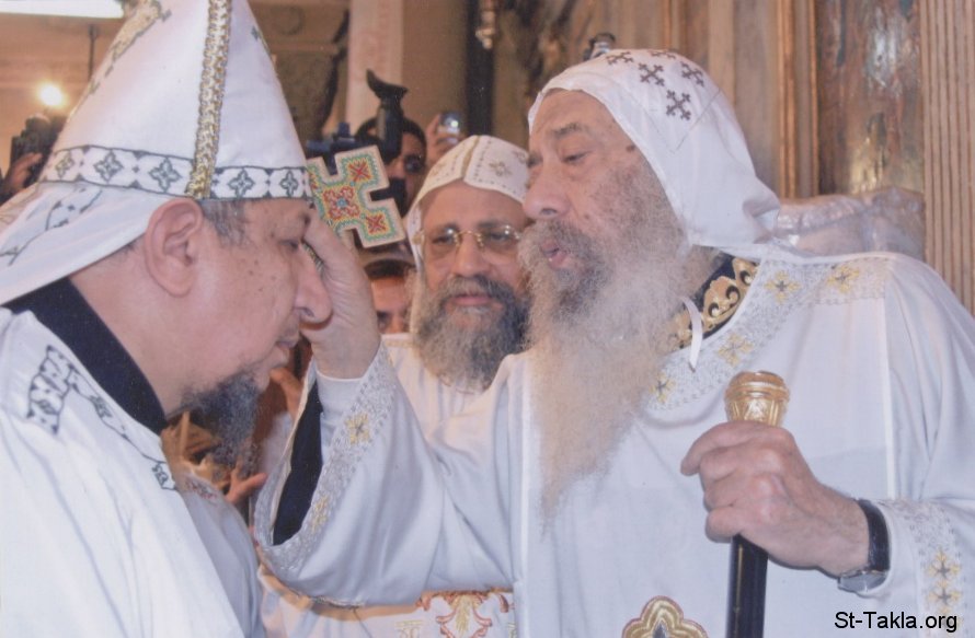 قداسة البابا شنوده ينفخ النفخة المقدسة في وجه قدس أبونا كيرلس قلته كاهن كنيسة القديس تكلاهيمانوت، الإسكندريةـ مصر، خلال رسامته قمصا. ويظهر في الخلف قدس أبونا الراهب شاروبيم الباخومي