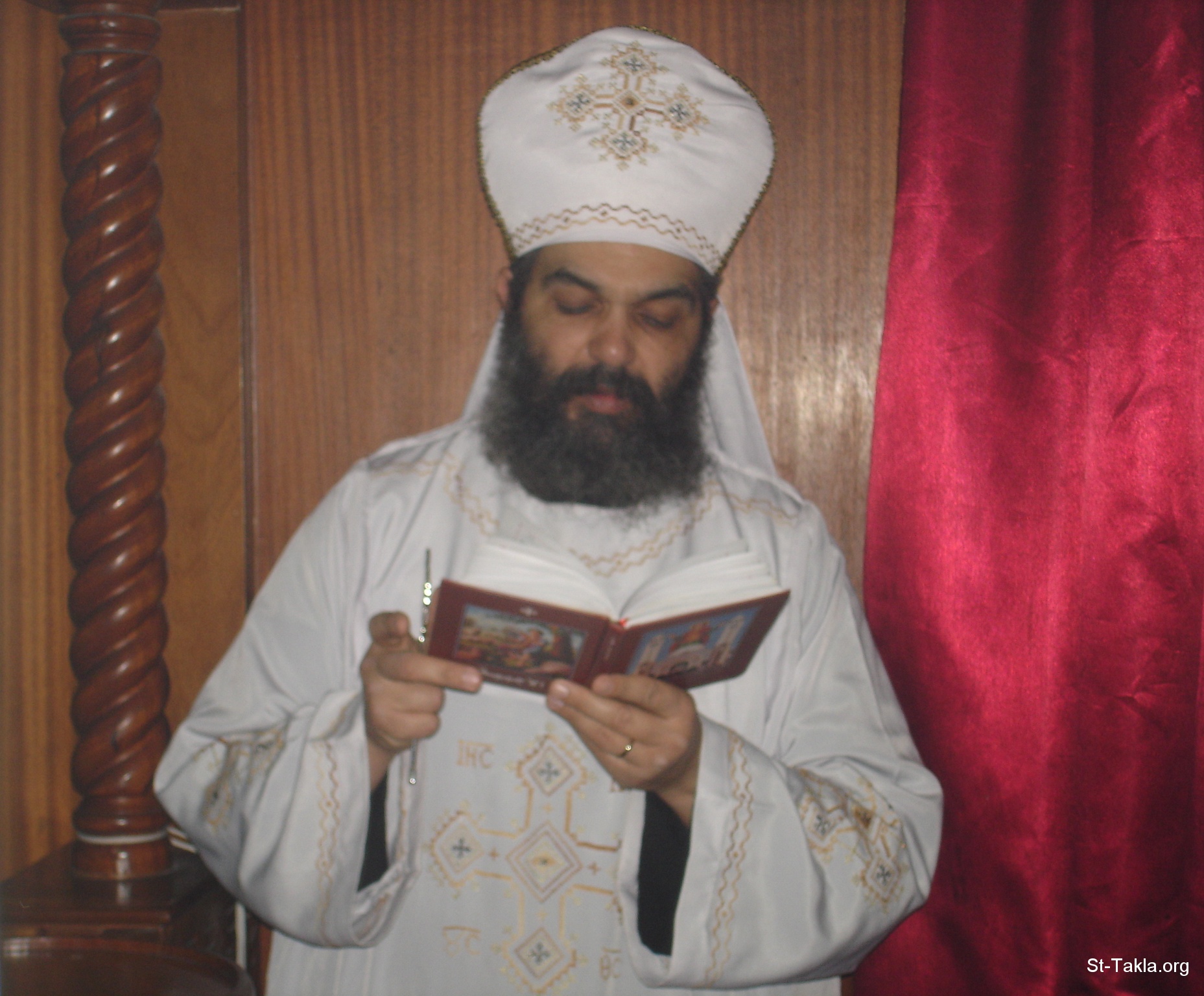كاهن يصلي ويقرأ من كتاب صلوات السواعي (الأجبية) - من قداس قدس أبونا القس تكلا وليم، كاهن كنيسة الأنبا تكلاهيمانوت القبطية الأرثوذكسية بالإبراهيمية بالإسكندرية، 24 مارس 2012 - تصوير مايكل غالي لموقع الأنبا تكلا هيمانوت.