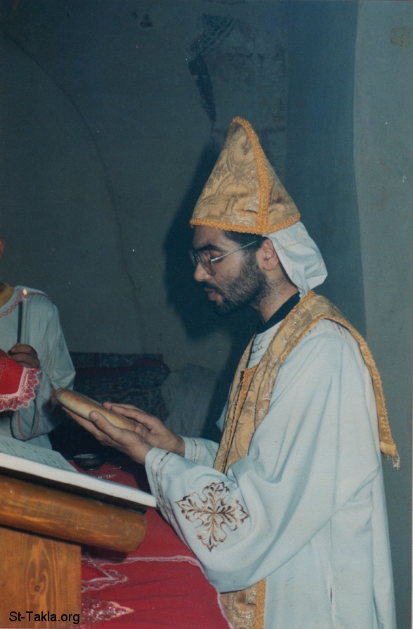 قدس أبونا القس تكلا وليم يصلي القداس الإلهي بعد رسامته، 1995 م.