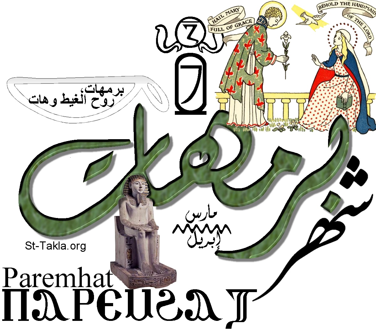 كلمة شهر برمهات، وهو الشهر القبطي السابع من الشهور القبطية المصرية. والكلمة مكتوبة باللغات العربية والإنجليزية والقبطية، مع صور وأشكال تعبر عن الشهر. فيوجد من الأمثال الشعبية لهذا الشهر: "برمهات، روح الغيط وهات"، أي موسم ازدهار الأشجار، واسم الشهر باللون الأخضر تعبيرًا عن الأمر. واسم الشهر يعني "شهر أمنحوتب الأول"، ويوجد صورته. وفي الخرطوش يوجد رقم الشهر (7)، وفي الدائرة المحاطة بالثعابين يوجد رقم الشهر بالقبطية. ويوجد صورة عيد البشارة المجيد: العذراء والملاك غبريال. وهو يقع ما بين شهري مارس وإبريل. - تصميم مايكل غالي لـ: موقع الأنبا تكلا هيمانوت