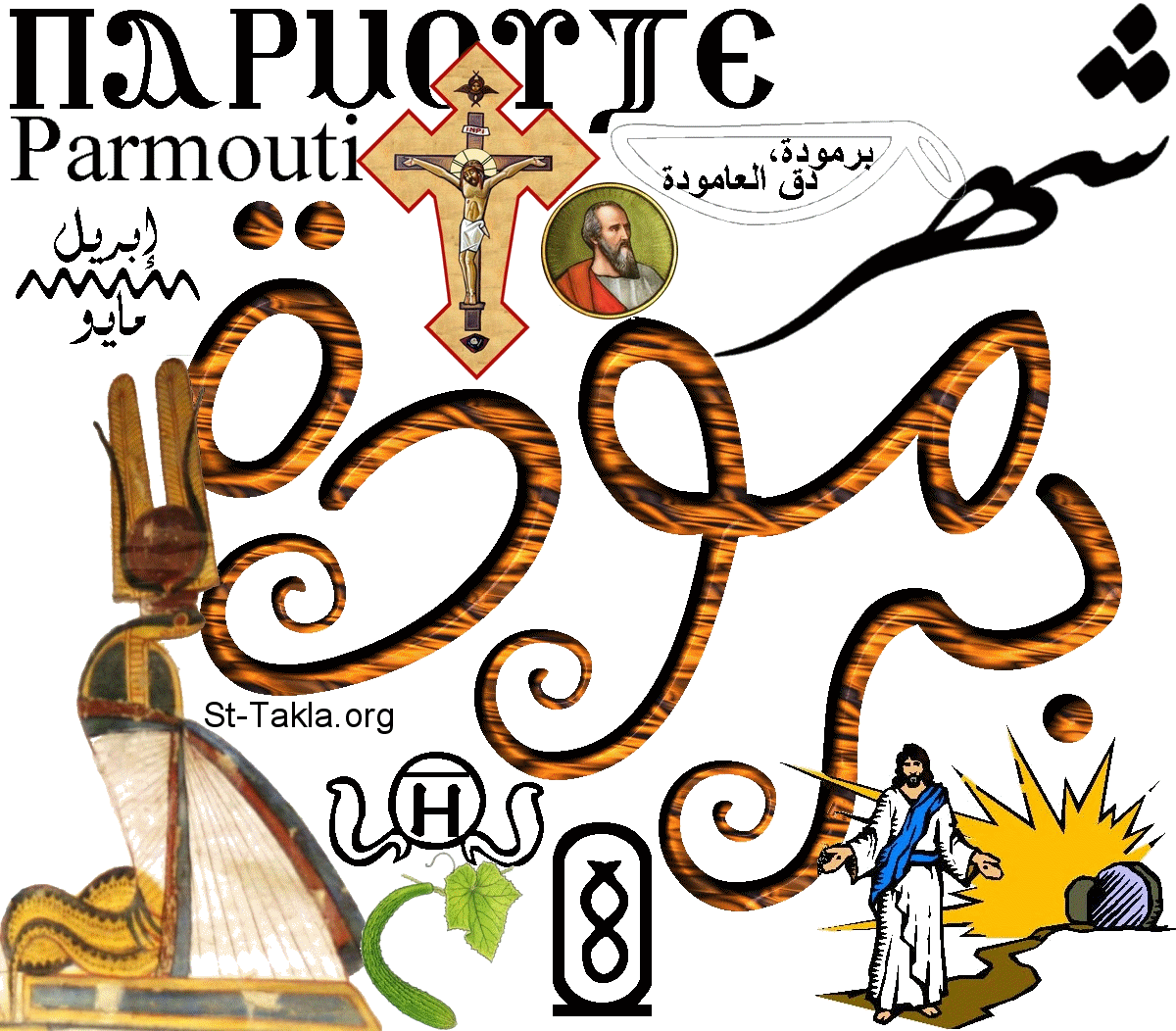 كلمة شهر برمودة، وهو الشهر القبطي الثامن من الشهور القبطية المصرية. والكلمة مكتوبة باللغات العربية والإنجليزية والقبطية، مع صور وأشكال تعبر عن الشهر. فيوجد من الأمثال الشعبية لهذا الشهر: "برمودة، دق العامودة"، أي دق سنابل القمح بعد نضجها. واسم الشهر مشتق من الإلهة "رينينوتيت" إلهة النمو والحصاد، ويوجد صورتها. وفي الخرطوش يوجد رقم الشهر (8)، وفي الدائرة المحاطة بالثعابين يوجد رقم الشهر بالقبطية. ويوجد صور الصلب والقيامة والشهيد مارمرقس من أحداث الشهر. وهو يقع ما بين شهري إبريل ومايو. وأخيرًا يوجد بعض نباتات هذا الشهر مثل الخيار. - تصميم مايكل غالي لـ: موقع الأنبا تكلا هيمانوت