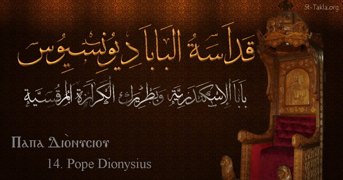 البابا ديونسيوس - بابا الإسكندرية وبطريرك الكرازة المرقسية (14) - الاسم باللغات العربية، القبطية، الإنجليزية - تصميم مايكل غالي لـ: موقع الأنبا تكلا هيمانوت، نوفمبر 2019 م.