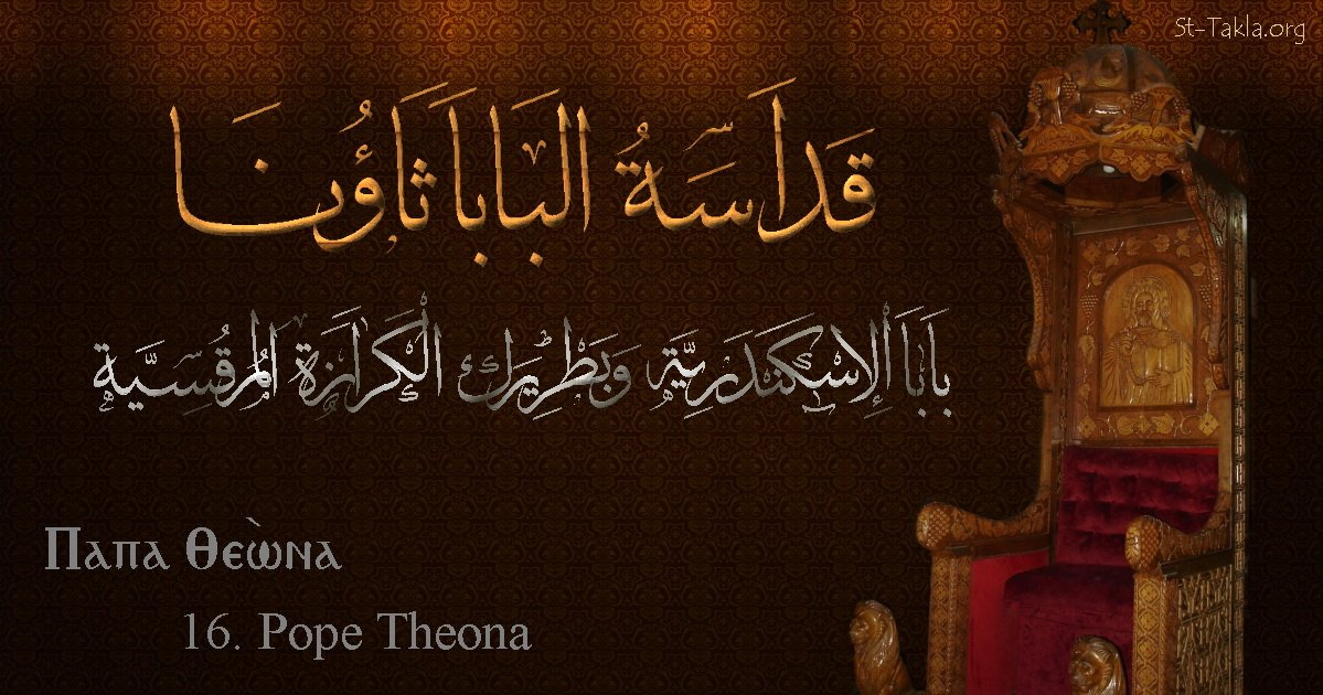 البابا ثاؤنا - بابا الإسكندرية وبطريرك الكرازة المرقسية (16) - الاسم باللغات العربية، القبطية، الإنجليزية - تصميم مايكل غالي لـ: موقع الأنبا تكلا هيمانوت، نوفمبر 2019 م.