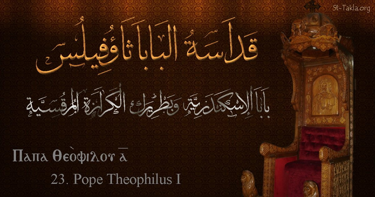 البابا ثاؤفيلس - بابا الإسكندرية وبطريرك الكرازة المرقسية (23) - الاسم باللغات العربية، القبطية، الإنجليزية - تصميم مايكل غالي لـ: موقع الأنبا تكلا هيمانوت، نوفمبر 2019 م.