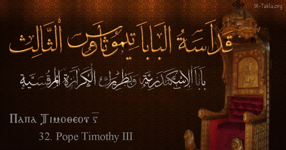 البابا تيموثاوس الثالث - بابا الإسكندرية وبطريرك الكرازة المرقسية (32) - الاسم باللغات العربية، القبطية، الإنجليزية - تصميم مايكل غالي لـ: موقع الأنبا تكلا هيمانوت، نوفمبر 2019 م.