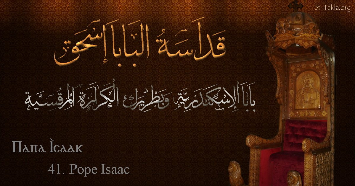 البابا إسحق - بابا الإسكندرية وبطريرك الكرازة المرقسية (41) - الاسم باللغات العربية، القبطية، الإنجليزية - تصميم مايكل غالي لـ: موقع الأنبا تكلا هيمانوت، نوفمبر 2019 م.