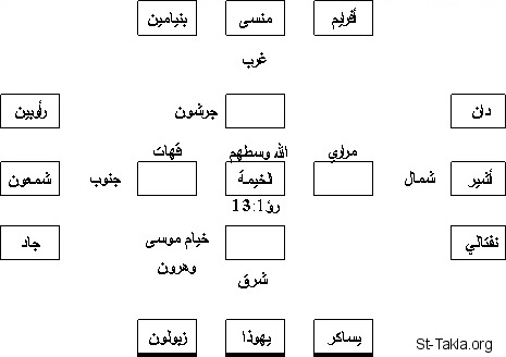 خيمة الاجتماع [الله في وسطهم (الرؤيا 1: 13)]، حولها جرشون، مراري، قهات + خيام موسى وهرون - حولها من جهة الغرب: افرايم، منسى، بنيامين - حولها من جهة الجنوب: رأوبين، شمعون، جاد - حولها من جهة الشمال: دان، أشير، نفتالي - حولها من جهة الشرق: يساكر، يهوذا، زبولون.