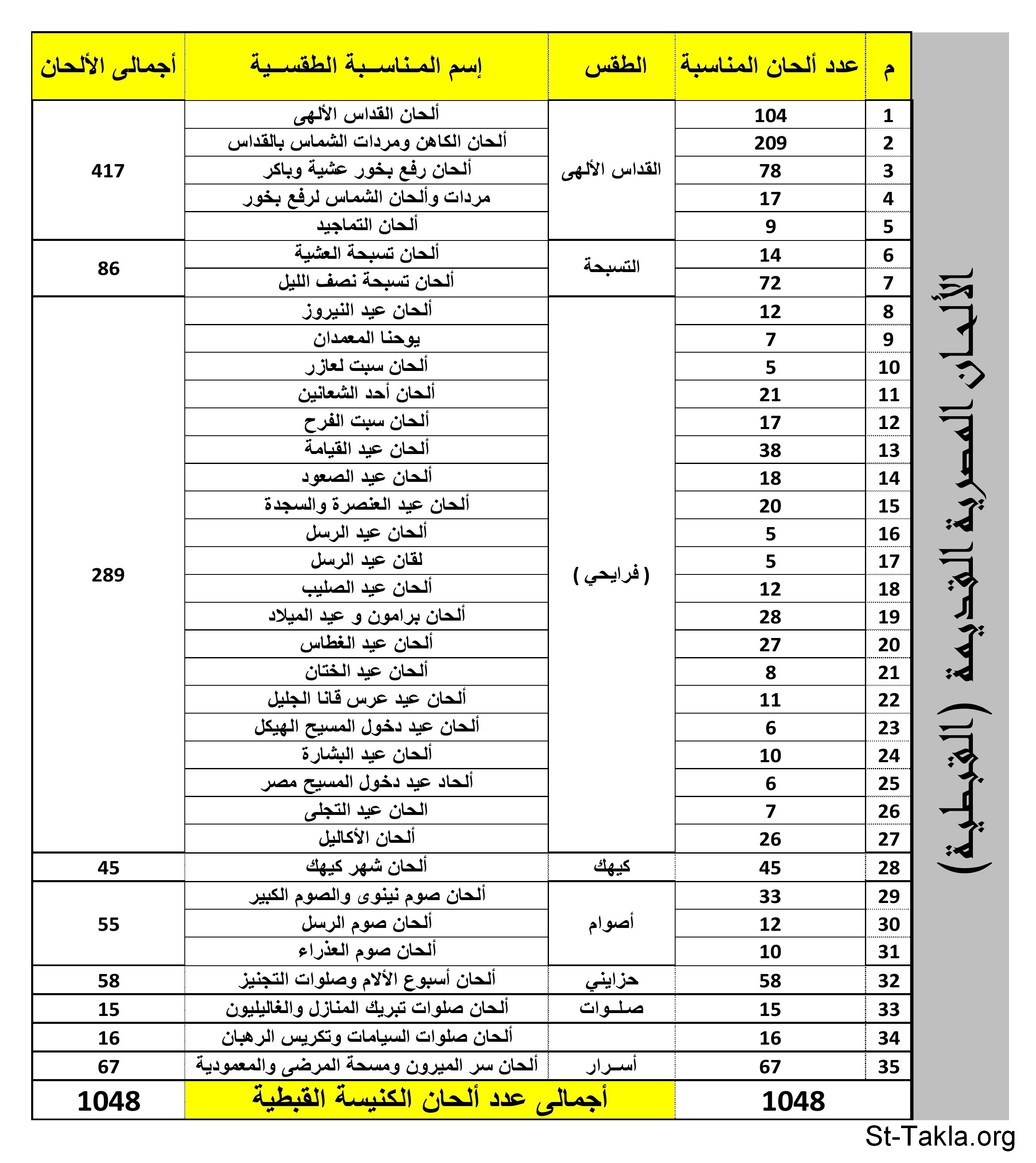 جدول يبين عدد الألحان القبطية فى المناسبات المختلفة (إعداد م. جورج كيرلس، مع أ. جورج عاطف من فريق دافيد) - من مقال موسيقية الألحان القبطية - م. جورج كيرلس.