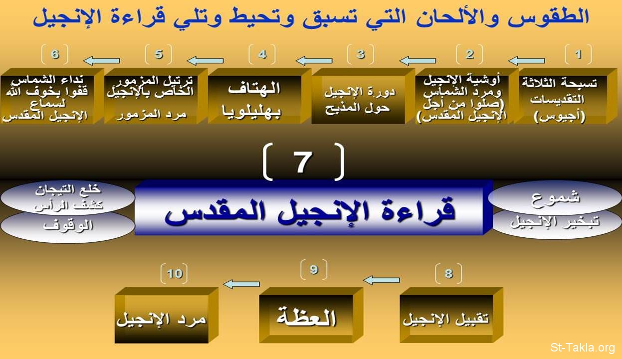 رسمة توضح الطقوس التي تسبق وأثناء وتلي قراءة الإنجيل (من مقال الألحان القبطية وأبعادها الخمسة - م. جورج كيرلس).