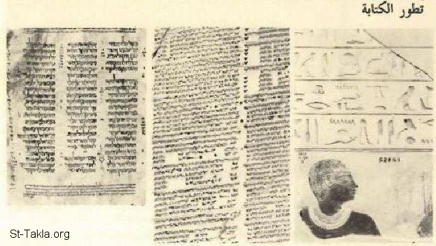 تطور الكتابة (من اليمين): الكتابة الهيروغليفية - تطورت الكتابة في بلاد بين النهرين التصويرية إلي المسمارية. طبعت هذه اللوحة تحتفظ في المكتبة الملكية الآشورية وترجع للقرن السابع - أصبحت الكتابة رموز يمثل كل منها حرفًا هجائيًا واللغة العبرية تحتوي علي 22 حرف.